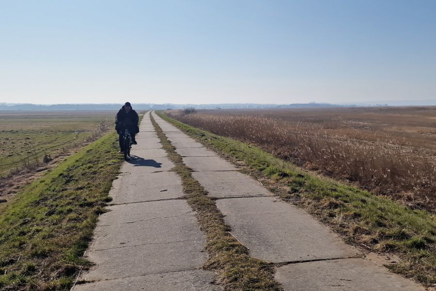 Frombork (Polonia), 8 marzo 2025. Alle 10.35 partiamo in sella alle nostre bici per… la frontiera russa, 27 chilometri a nord-est. I primi 23 sono di pista ciclabile ora di terra, ora di cemento, ora di sabbia, ora di fango. Il tempo è ottimo, cielo grigiolino ma sostanzialmente limpido. Godiamo poi per lunghi tratti di un bel sole, che ci induce a togliere il maglione e restare col giubbotto aperto. Ci avevano detto di essere fortunati: in questo periodo solitamente quest'angolo di Polonia settentrionale (Pomerania) ha ancora neve, e benché il "generale inverno" sia ormai agli sgoccioli, le temperature di inizio marzo raramente superano i 4°. Stavolta siamo invece sugli 8°/10°, il che rende strade e piste ciclabili interamente transitabili e ormai prive del ghiaccio di appena una settimana addietro.