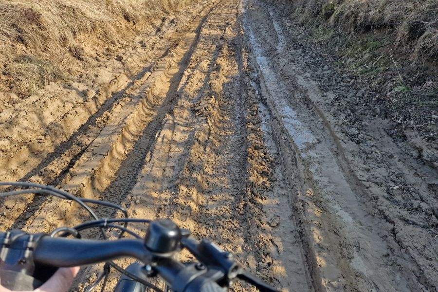 La prima tappa in bici dura un’ora esatta (10.35-11.35) e ci immerge nella vegetazione multicolore di queste latitudini. A sinistra abbiamo il Mar Baltico, ma gli alberi pur spogli ce lo negano alla vista. Ne sentiamo la brezza e il rumore dell’acqua. Filari di arbusti, erba, fieno e fango qua e là, qualche canale e fondo della pista ora cementato, ora in terra, ora di fieno e arbusti. Insomma, il giallo la fa da padrone. Quando il sentiero scompare, almeno in 3/4 occasioni, si procede a intuito, ma la direzione è quasi sempre giusta, e dopo un po' riprende il sentiero o il cemento.