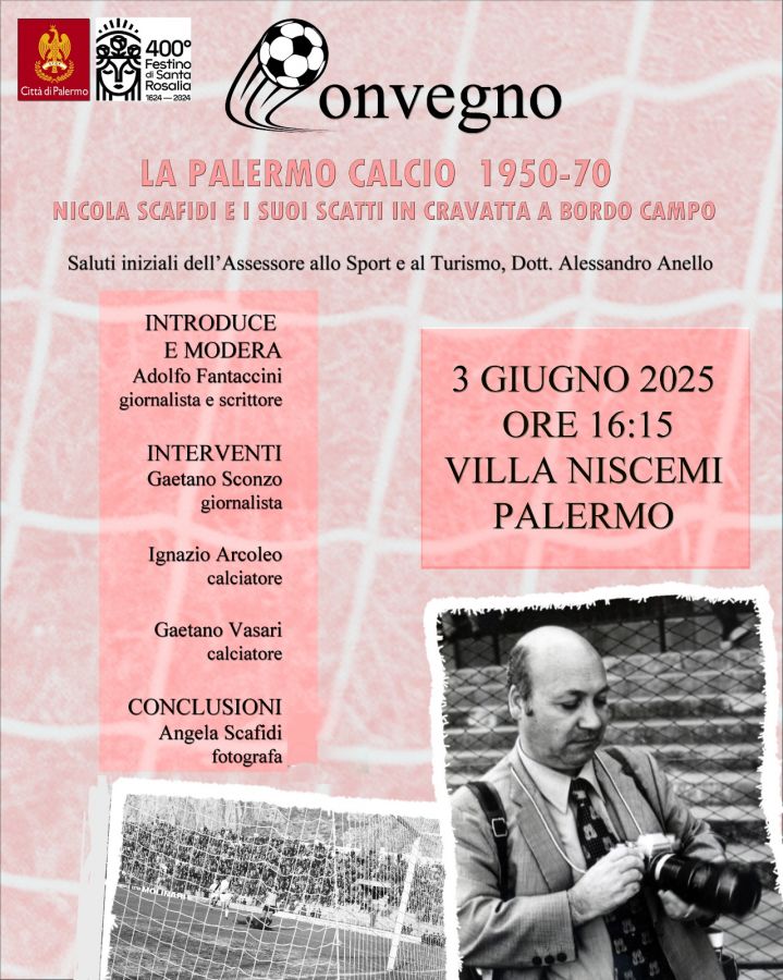 Fotografo ufficiale del Palermo Calcio per decenni, inappuntabile nella sua eleganza a bordocampo, da dove eseguiva appunto “scatti in cravatta”, Scafidi ha immortalato partite e calciatori in maglia rosa di varie epoche, dal dopoguerra agli anni ’80.