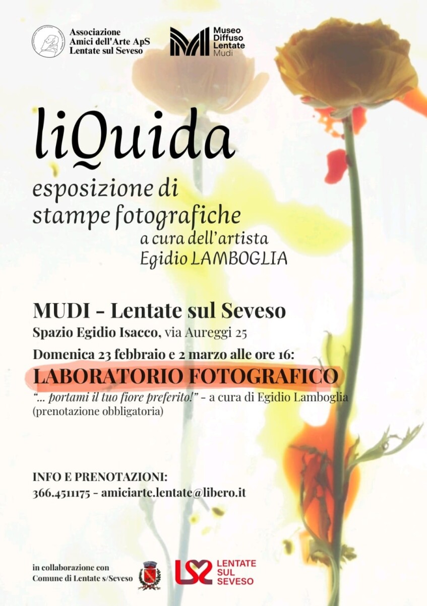 Il 15 febbraio al MUDI di Lentate sul Seveso, via Aureggi 25 é stata inaugurata la mostra fotografica di Egidio Lamboglia dal titolo "LiQuida" in cui sono esposte alcune delle stampe fotografiche che l'artista realizza su carta cotone e non su carta baritata, con una particolare tecnica quindi, che sembra spezzare il confine tra immagine fotografica e dipinto.