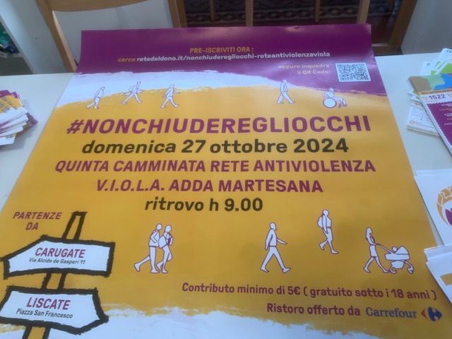 NON CHIUDERE GLI OCCHI” è lo slogan in testa alla Quinta Camminata della Rete Antiviolenza V.I.O.L.A. Adda Martesana, che sabato 27 ottobre alle ore 9.00 coinvolgerà i cittadini di Carugate, Liscate, Segrate e Pozzo D’Adda.