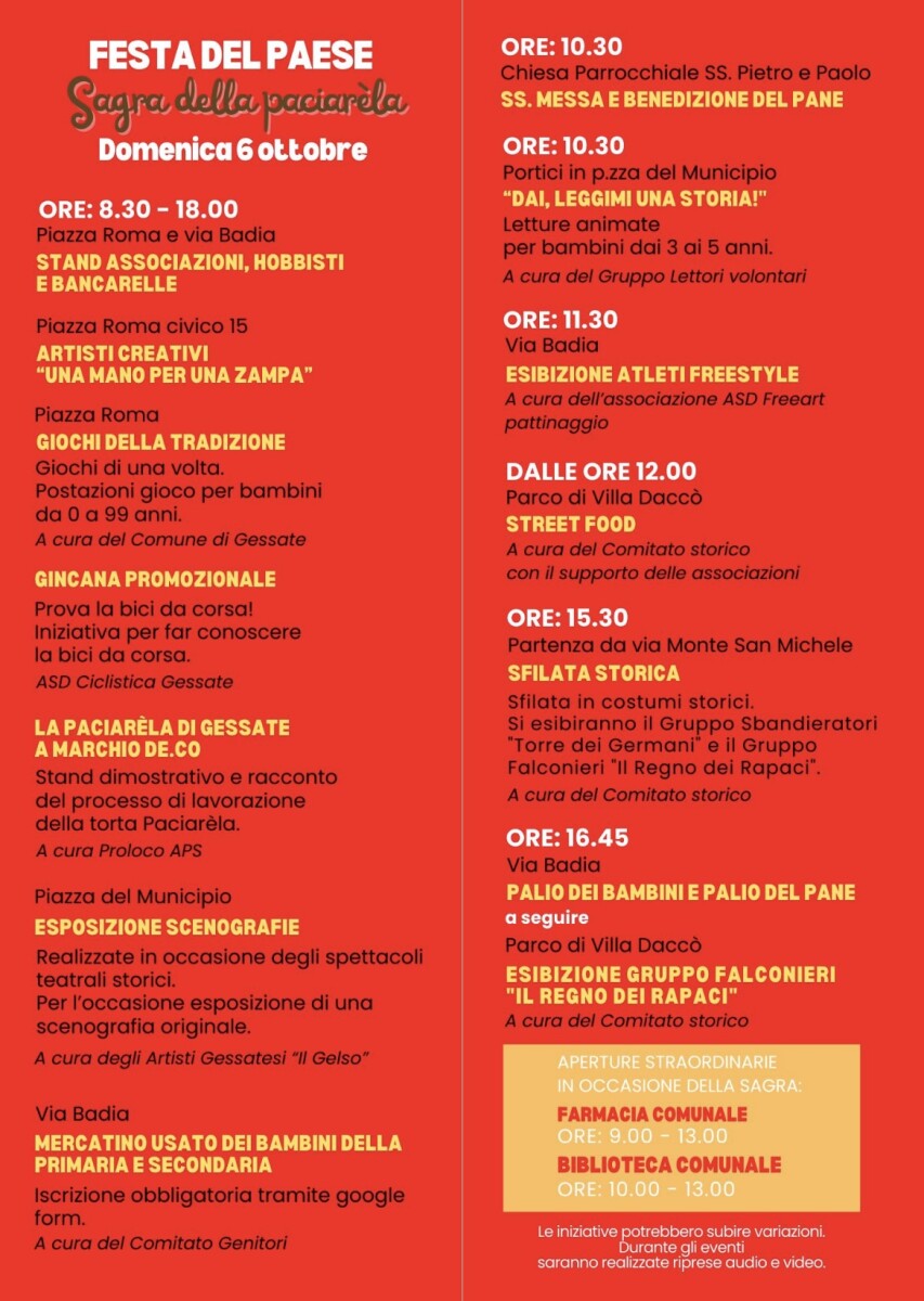 Ogni anno, nella prima domenica di ottobre, Gessate celebra la Sagra della Paciarèla, una festa dedicata a un dolce tipico della tradizione lombarda. Ideata nel 1971, questa giornata è un’occasione per rivivere i sapori di una volta e riscoprire la torta di latte, o torta campagnola, conosciuta localmente come paciarèla.