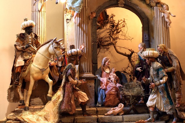 Ma, ad un certo punto, arrivano nel presepe i magi. Qualsiasi cosa si pensi della loro origine, l’evangelista lascia intuire un'origine dal lontano oriente – il termine “magi” fa pensare alla Persia. Ma quei magi sono la concretizzazione di tutti i popoli che avrebbero accolto il Vangelo, come aveva annunziato l’antica profezia di Isaia. Ecco che i magi assumono talvolta i volti delle tre età dell’uomo, il giovane, l’adulto, l’anziano – così ad esempio in Giorgione. Oppure assumono le sembianze di tre re provenienti dai tre continenti allora conosciuti: l’Africa (uno di loro spesso è dipinto come nero di carnagione), l’Asia, l’Europa. Altre volte si aggiunge l’appartenenza di uno di loro alla popolazione araba. quindi, si potrebbe dire, gli Arabi giungono al Presepe sette secoli prima dell'invasione musulmana, attraverso uno di quei cercatori di Dio che si reca al presepe insieme ai rappresentanti simbolici degli altri continenti. I magi aprono il presepe alla terra intera. In quello sperduto luogo del medio oriente, il mondo intero è convocato a gioire. Ecco perché con grande sapienza i presepi della tradizione italiana, in particolare quello napoletano, aggiungono figure di ogni luogo e tempo: nel presepe ci sono tutti. E se ci si recasse a comprare statuine a Napoli a San Gregorio Armeno, si troverebbero statuine di Obama, di Higuain, di Renzi, di Putin, di Assad, del presidente dell’Iran Rouhani, di Abu Mazen e di tanti altri [Nota 2017... oggi forse sarebbe più difficile trovare Higuain, mentre a fianco di Obama ci sarebbe pure Trump e con Renzi anche Gentiloni, Beppe Grillo, la Raggi e la Meloni]. Se dovessi fare un presepe in una scuola, ci metterei i profughi che attraversano il mare, ci metterei i giovani del Bataclan di Parigi, ci metterei Myriam, la bambina iraqena che perdona gli uomini neri di Daesh, ci metterei papa Francesco, ci metterei la mia famiglia e quelle dei miei amici, ci metterei cristiani, ma anche figure di uomini di altre religioni, perché quel bambino è venuto per tutti [Nota 2017... e per fortuna e purtoppo l'elenco sarebbe oggi più lungo].