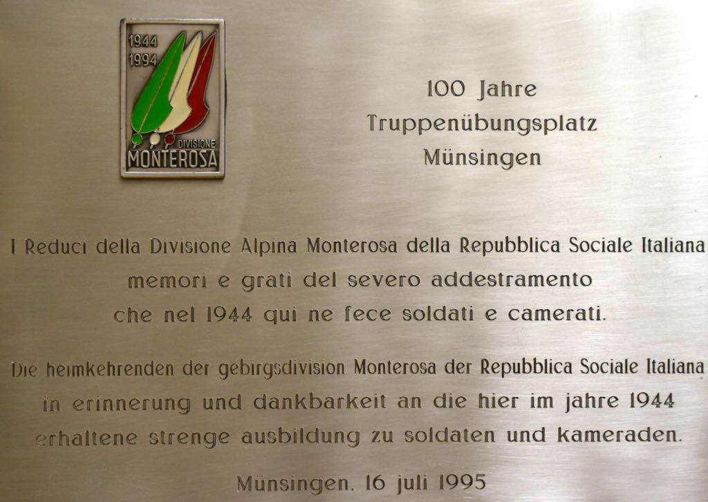 Lì aveva sede uno dei campi di addestramento militare più grandi e più antichi di Germania: l’Altes Lager. Oggi è in parte chiuso, in parte riconvertito a campo di accoglienza profughi. Entro a Munsingen dopo 45 minuti d’auto (ore 13.50), di cui la prima metà di autostrada. Scopo della mia venuta qui è tornare a ritroso a 71 anni fa, quando (metà febbraio 1944), arrivarono in treno dall’Italia 20.000 alpini, che qui avrebbero costituito la divisione “Monterosa”, la prima e più grande unità militare regolare dalla Repubblica Sociale Italiana. La “Monterosa” sarà composta da quasi 4.000 soldati provenienti dal disciolto Regio Esercito e, per la parte restante, dalle reclute delle classi 1924 e 1925. A Munsingen, sotto la supervisione di istruttori tedeschi, armata ed equipaggiata dai tedeschi, la divisione trascorse 6 mesi di duro addestramento. La stazione è uno dei primi edifici che s’incontrano entrando in paese da ovest. E’ una graziosa struttura a un piano, con all’estremità una specie di torretta a tetto spiovente. Le finestre ornate di fiori, l’assenza di sporcizia per terra e di quelle orribili scritte che deturpano i muri delle nostre città ma che noi spacciamo per arte, e il basso tono con cui conversano i pochi passeggeri presenti, regalano quel magnifico senso di ordine, pulizia e rispetto altrui che mi fa amare la Germania. Tranne il colore delle pareti esterne (nel 1944 era verde scuro anziché giallo-ocra come oggi) la stazione è come allora. Scatto foto fra i binari, specie verso sinistra (direzione Ulm) da dove arrivarono le tradotte di alpini, quindi faccio fuori due panini e chiacchiero con un barbuto funzionario della DB (“Deutsche Bahn”, le ferrovie tedesche). O meglio, più che chiacchierare recepisco un decimo di quanto mi dice in lingua inglese. Mi sposto poi in centro. Carino. La piazza principale è circondata da case a graticcio e sormontata al centro da una di quelle classiche fontane esagonali con fiori sulla sommità che si trovano nei paesi alpini tedeschi, svizzeri e austriaci. Ho fretta di raggiungere il lager, così alle 15.05 prendo la strada che sale al “Truppenbungsplatz” e giungo al campo. Tranne un arco, oggi demolito, e le insegne direzionali, l’ingresso è rimasto tale e quale allora. La prima parte del campo presenta un vialone centrale ai cui lati si trovano le camerate più curate e accessoriate (costruzioni basse e lunghe in mattone rosso, ingressi con disimpegno in legno e vetro, infissi rossi all’interno e finestre a cupola con inglesine bianche ai vetri e ante esterne di legno verde). Un tempo destinate agli ufficiali (tedeschi, italiani o, nel dopoguerra, francesi che fossero...), ospitano oggi una quota di profughi siriani scappati da casa loro.