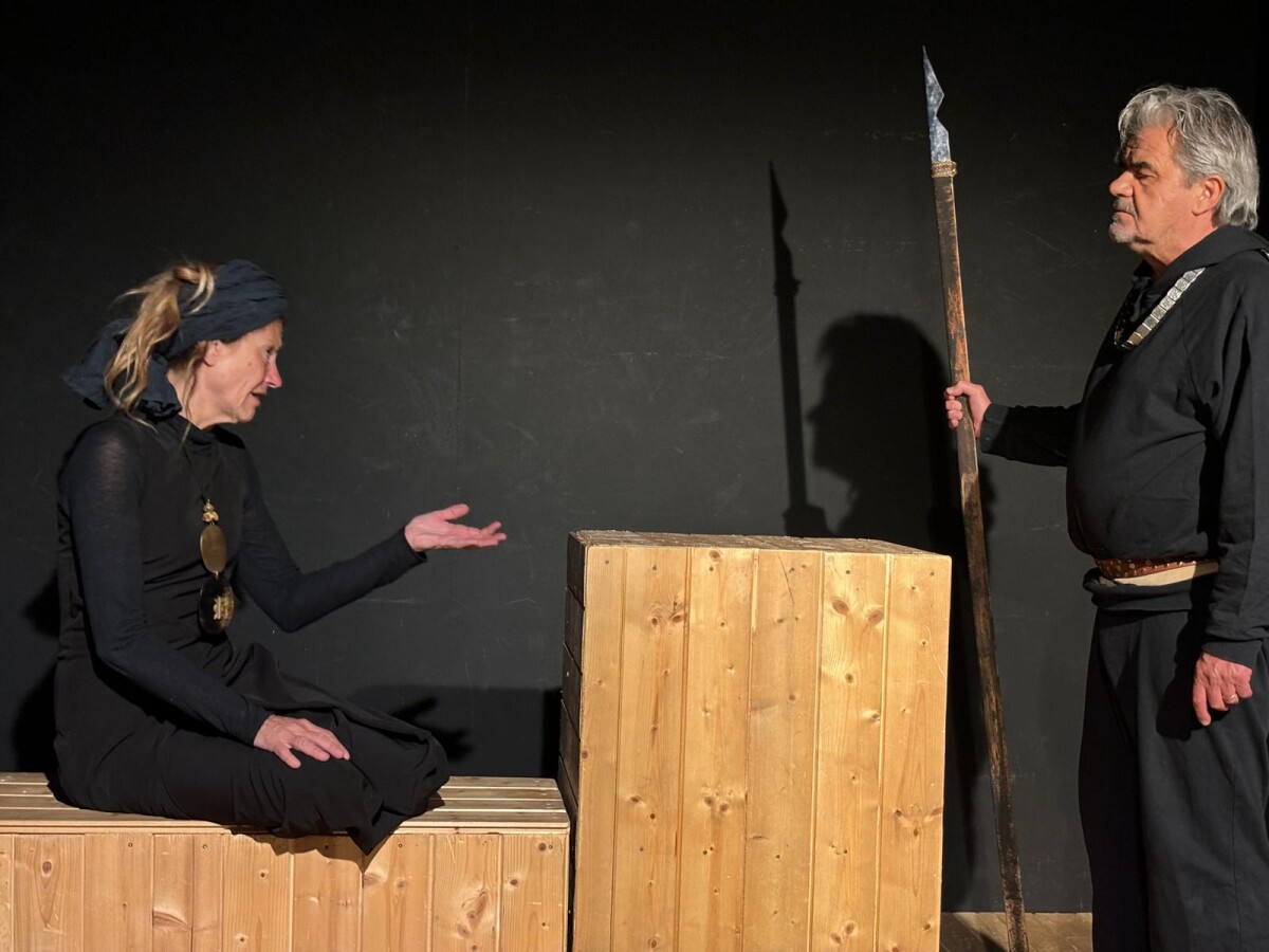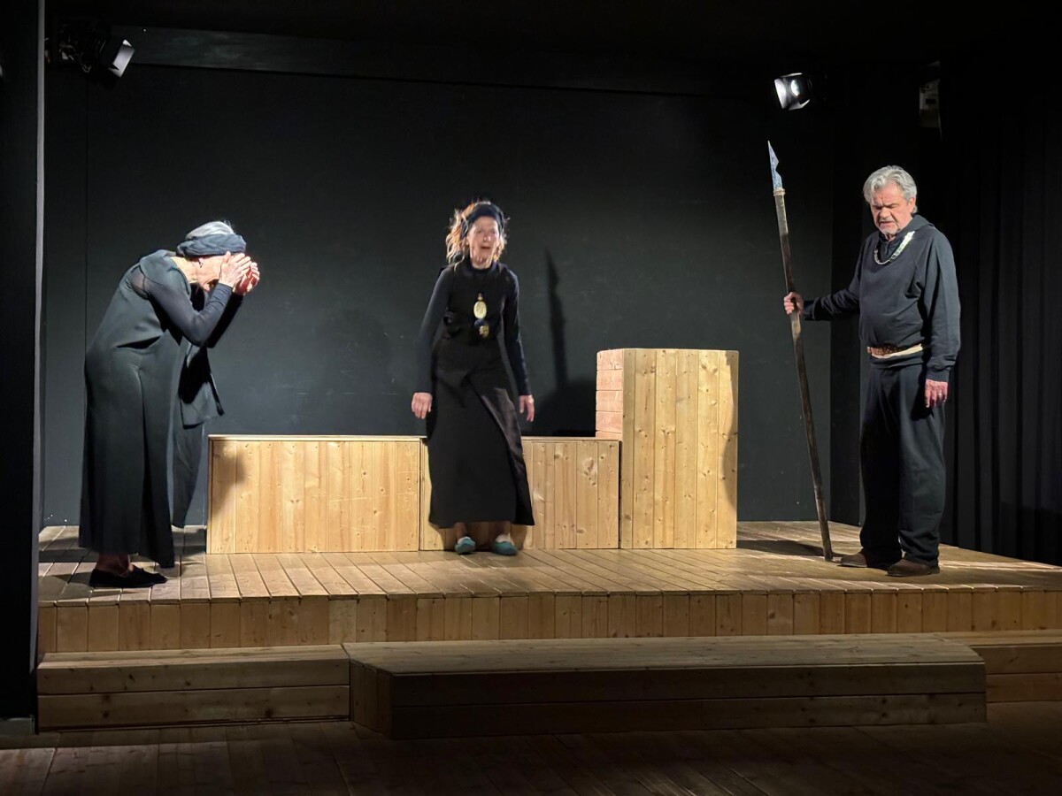 Su un palco, allestito sobriamente con assi e strutture di legno, assistiamo a una tragedia che anche la scena evidenzia. Due lastre di truciolato, infatti, dividono la scena a significare da un lato la commedia della vita con le sue gioie, dall’altro il dramma a cui tutti noi siamo sottoposti come la tragedia e la morte.
